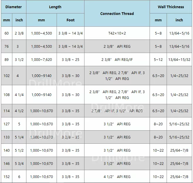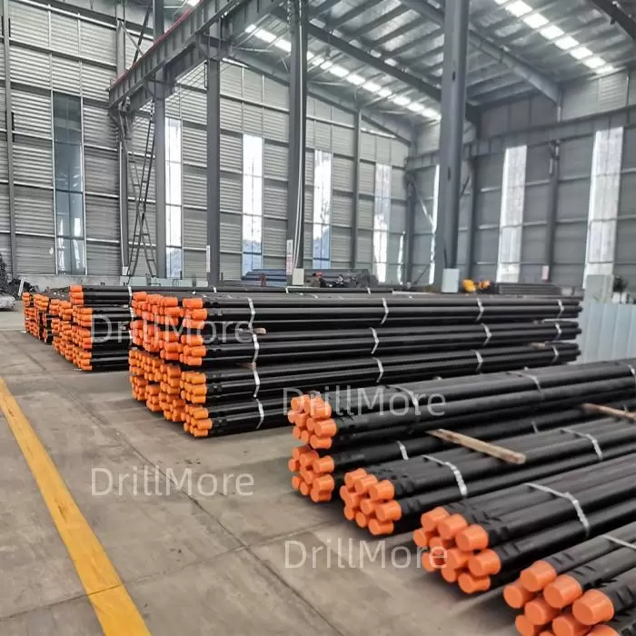 DrillMore manufactures a complete range of drill rods/drill tubes/drill pipes for DTH drilling, with several different thickness designs for each diameter, made from different grade steels for selection. DrillMore's DTH drill rods are well heat-treated, precision manufactured, and friction-welded. Our DTH drill pipes are used worldwide with Sandvik, Atlas Copco and many other popular brands of DTH drilling rigs.