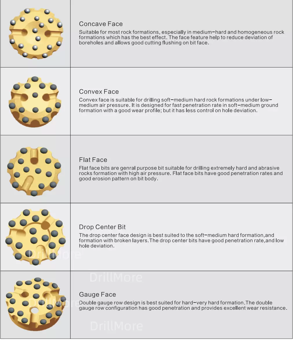 DrillMore supply DTH Drill Bits are available in a wide range of sizes and with a number of custom design features for optimum performance in a rock formation, which are designed to match all conceivable applications for water well industries, mining and construction.