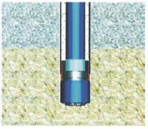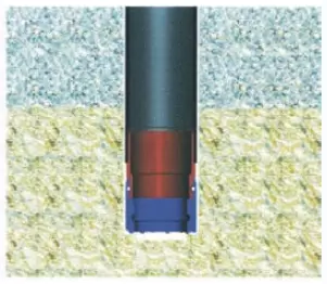 | Ring bit and casing shoe assembly is welded to casing prior to drilling. Lock the assembly into pilot bit with hammer. The pilot bit's shoulder engages the shoulder of the casing shoe. | Hammer's percussive energy is transferred through the pilot and ring bits, crushing rock . Part of impact energy advances casing. | On completion of drilling and casing , the drill string with pilot bit is retrieved by a slight reverse rotation to unlock the bayonet coupling . The ring bit stays in the hole , and can be recovered only if the casing is retrieved. | If drilling continues to the desired depth in the bedrock is required, using a conventional DTH drilling bit. |