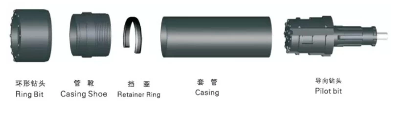 Concentric Casing Components: pilot bit, casing, retainer ring, casing shoe, ring bit.