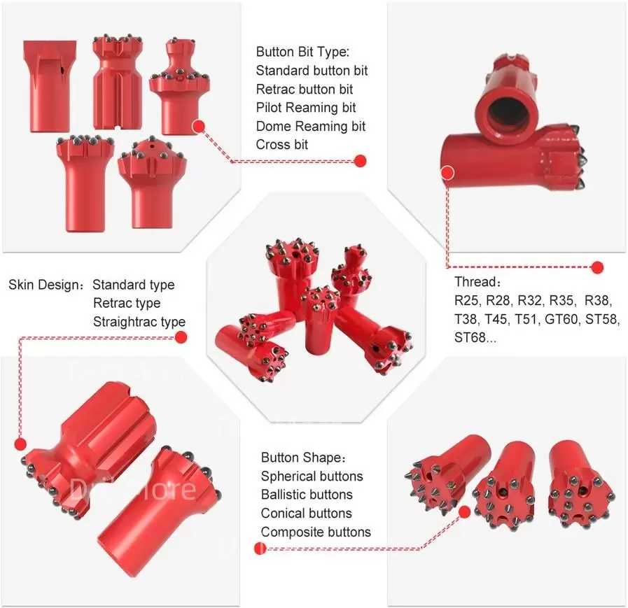 We offer different threaded Button Bits. Including standard button bit, retrac button bit, reamer bit, spherical button drill bit, ballistic button bit, flat face drill bit, drop center drill bit etc. What's more, custom design of hard rock drilling bits is supported. From following picture you can know better about DrillMore's drill bits.